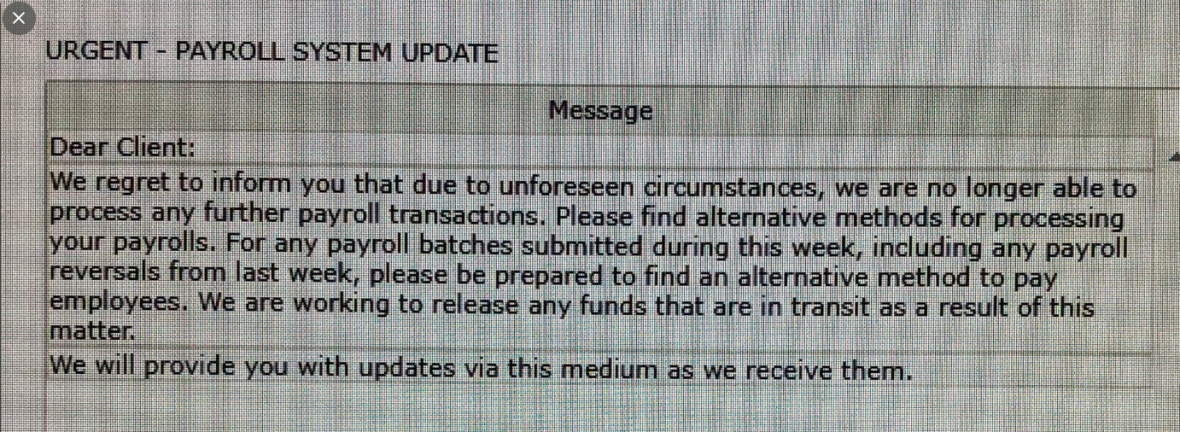 My Payroll HR disappears with over 35 million dollars, leaving only this message for explanation.